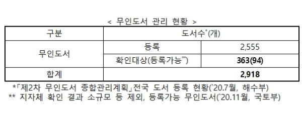 국토부는 그간 지형도, 해도 등에 위치가 표시되지 않았거나, 표기 오류로 발견이 되지 않아 관리 사각지대에 있었던 미등록 섬을 지적공부에 조사·등록하여 전국의 섬 정보를 포함한 국토 관리에 효율성을 높이고, 해수부는 “제2차 무인도서 종합관리계획(`20.7)”에 따라 무인도서 이용 상태와 환경 등을 조사하는 실태조사(‘07~)를 시행 중으로, 지리적 고립성, 접근성 미흡 등을 해결하기 위한 현대적 조사기술을 도입하여 무인도서 관리의 실효성을 높이고, 국토부와 공동으로 미등록 무인도서를 지적공부에 등록하는 작업을 추진한다고 밝혔다.