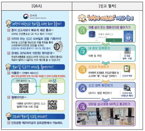 입국 여행자가 앱(App)을 통해 휴대품을 신고하면 QR코드가 생성되고, 해당 QR코드를 공항 입국장에 설치된 ‘자동 심사대’에 인식시킨 후 통과하면, 세관 신고가 완료된다.