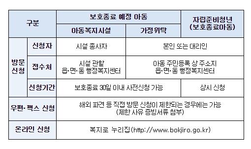 자립준비청년 본인이나 그 대리인이 주민등록 주소지 읍·면·동 행정복지센터를 방문하거나, 복지로 누리집에서 온라인으로 신청이 가능하다.