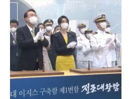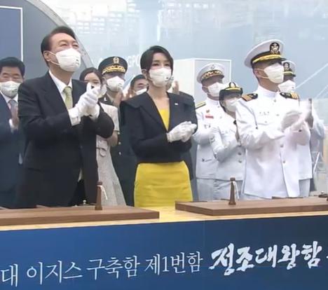윤 대통령과 김건희 여사는 축사 후 이어진 진수선 절단 및 안전항해 의식을 통해 정조대왕함의 탄생을 축하하고 안전항해를 기원했다.