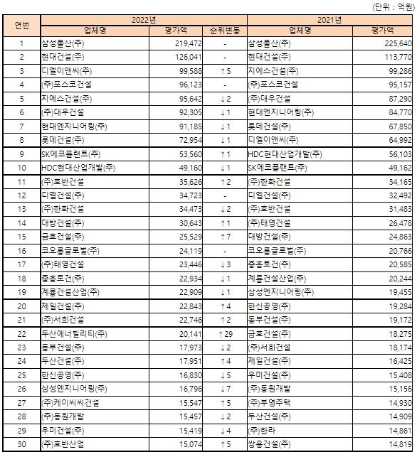 ‘22년도 시공능력평가 결과, 토목건축공사업종에서 삼성물산㈜이 21조 9,472억원으로 1위를 차지했다.