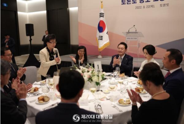 행사 중 윤 대통령은 동포들이 종사하는 각 분야의 생활상과 애로사항을 직접 듣고, 북미 지역의 한류 중심지이기도 한 토론토 지역에서 한국의 위상을 널리 알려 줄 것을 부탁했다.