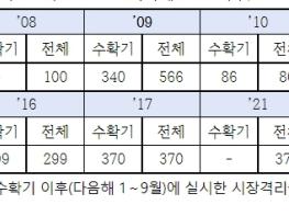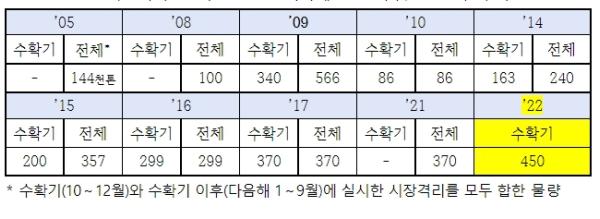 한편, 이번 시장격리 물량 45만 톤과는 별개로 작년보다 10만 톤 증가한 공공비축미 45만 톤을 포함하면 올해 수확기에는 총 90만 톤이 시장에서 격리되는 효과가 생기게 된다. 이 역시 ’05년 공공비축제도 도입 후 수확기로는 최대 물량이다. 올해 격리되는 90만 톤은 ’22년 예상 생산량의 23.3%에 달하며, 쌀 생산량 중 수확기에 시장에서 격리(공공비축+시장격리)되는 비율이 과거 8.3~18.1%였던 점을 감안하면 가장 높은 수준이다.