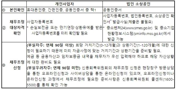 온라인 플랫폼을 통해 신청하시려는 자영업자?소상공인 분들은 온라인 플랫폼 접속 전에 본인확인, 채무조정 대상 자격 확인, 채무조정 신청에 필요한 사항을 미리 준비해야한다.