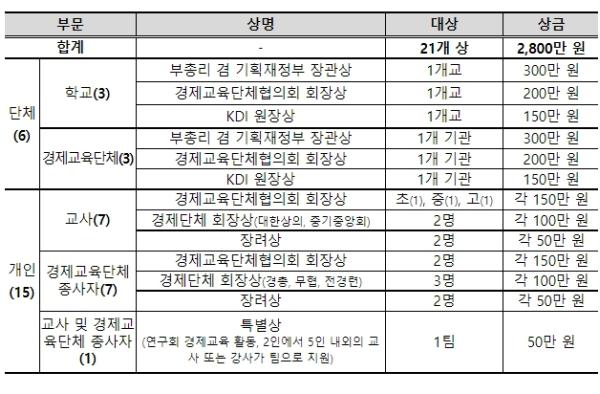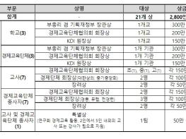 금년에는 경제 부총리상, 경제교육단체협의회 회장상 등 총 21개의 상이 수여되며 개인 최고 150만원, 단체 최고 300만원의 상금이 지급될 예정이다.