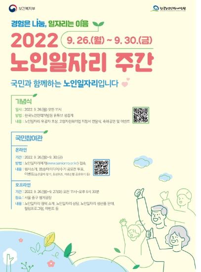 보건복지부는 노인일자리 및 사회활동 지원사업에 대한 사회적 관심을 환기하고 정책에 대한 국민 공감을 제고하기 위해 9월 26일부터 9월 30일까지 ?2022 노인일자리 주간?을 운영한다고 밝혔다.