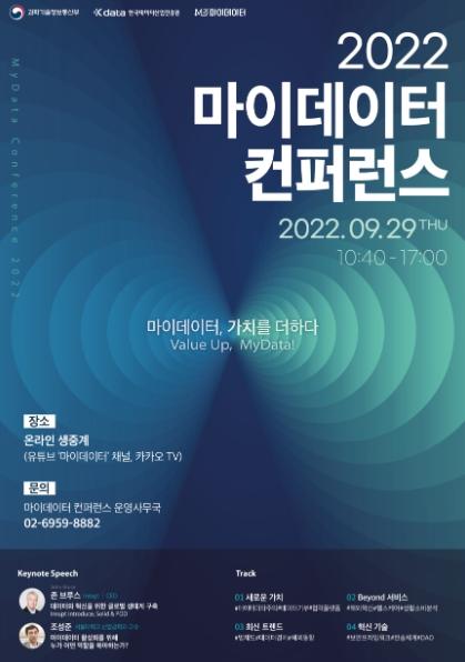 과학기술정보통신부가 주최하고 한국데이터산업진흥원(원장 윤혜정)이 주관하는 ‘2022년 개인맞춤형정보(마이데이터) 학술회의(콘퍼런스)’가 9월 29일 '개인맞춤형정보, 가치를 더하다(Value up, Mydata!)'를 주제로 온라인으로 개최된다.