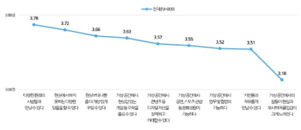 메타버스 이용자 인식조사 결과에 따르면, 메타버스의 장점(5점 만점)은 ‘다양한 환경의 사람들과 만날 수 있다’가 3.78점, ‘현실에서 하지 못하는 다양한 일들을 할 수 있다’가 3.72점으로 높게 나타났다.