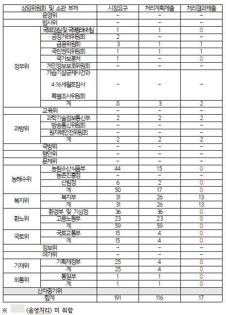 부처별로 보면, 농림축산식품부가 44건의 시정요구 中 단 한 건도 처리결과를 제출하지 않았으며 환경부·기상청 36건, 기획재정부 25건, 고용노동부 23건, 국토교통부 14건 모두 처리결과를 국회에 한 건도 제출하지 않았다. 보건복지부의 경우 33건의 시정요구 中 가장 많은 13건의 처리결과를 국회에 제출했다.