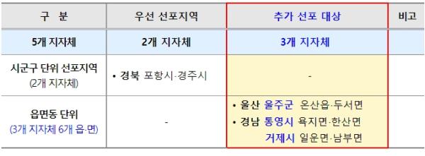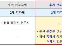 중앙재난안전대책본부(본부장 : 이상민 행정안전부 장관)는 이번에 추가로 선포하는 울산 울주군, 경남 통영시?거제시는 읍?면 단위로 선포한다고 전하며, 특별재난지역으로 추가 선포된 지자체는 우선 선포지역과 동일하게 지자체가 부담해야 하는 복구비의 일부(약 50~80%)가 국비로 전환되어 재정부담을 덜 수 있게 된다고 밝혔다.