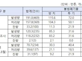 지역별 방치된 불법폐기물 발생 규모는 경기 57만8481톤, 경북 34만5628톤, 충남 6만317톤, 경남 4만9159톤, 전북 3만4644톤 순으로 나타났다. 투기된 불법폐기물 양은 경기 21만2710톤, 경북 14만9663톤, 전남 11만2108톤, 충남 7만7552톤, 전북 6만653톤 순으로 많게 나타났다.