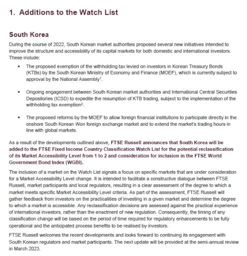 한국이 관찰대상국(레벨1→2)에 등재된 것은 FTSE가 2019년 3월 채권시장 국가분류에서 한국의 시장접근성을 레벨1으로 평가한 이후 처음이다.