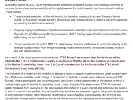 FTSE Russell은 한국 정부가 외국인 국채?통안채 투자 비과세, 외환시장 선진화 방침, 국제예탁결제기구(ICSD) 통한 국채 거래 활성화 계획 등을 발표하는 등 그동안 외국인 채권 투자를 저해해왔던 요인들에 대한 제도 개선을 추진하고 있어 레벨 상승 가능성이 있다고 평가했다.