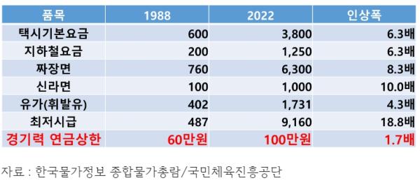 더불어민주당 임오경 국회의원(광명갑/문화체육관광위원회)이 한국물가정보의 종합물가총람과 국민체육진흥공단의 경기력 성과포상금 추이자료를 비교 분석한 결과 지난 30년간 최저시급은 18.8배 인상된 반면 올림픽 등 국제대회 입상자에게 지급되는 경기력향상 연구연금 월 상한액은 불과 1.7배 인상에 그친 것으로 나타났다.