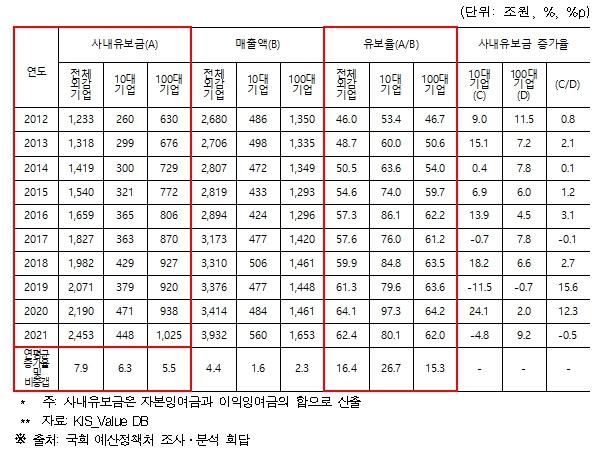 상위 10대 기업 사내유보금은 같은 기간 260조에서 448조로 증가했다. 전체 외감기업의 사내유보금은 2012년 1,233조원에서 2021년 2,453조원으로 2배가 증가했다.