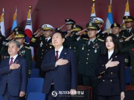 윤 대통령은 이종섭 국방부 장관을 비롯한 군 주요직위자, 현행작전 및 강군 육성에 이바지한 이준일 육군 중령 등 육·해·공군 및 해병대 장병, 6·25전쟁 참전용사인 해병대 1기 이봉식 옹, KF-21과 현무-II·III 연구 개발에 참여한 윤종호, 김영철 박사, 미래 국군의 주역인 각군 사관생도 등 24명과 함께 행사장에 입장했다.