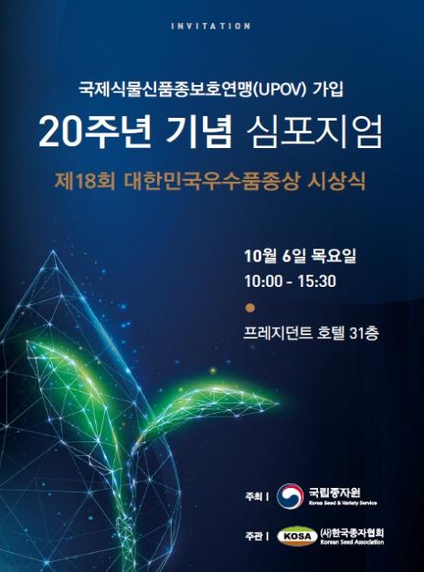 국립종자원(원장 김기훈)은 10월 6일서울 프레지던트호텔에서 제18회 대한민국 우수품종상 시상식과 우리나라의 국제식물신품종보호연맹(UPOV) 가입 20주년을 기념하는 심포지엄을 개최한다.