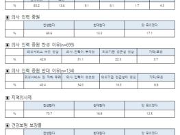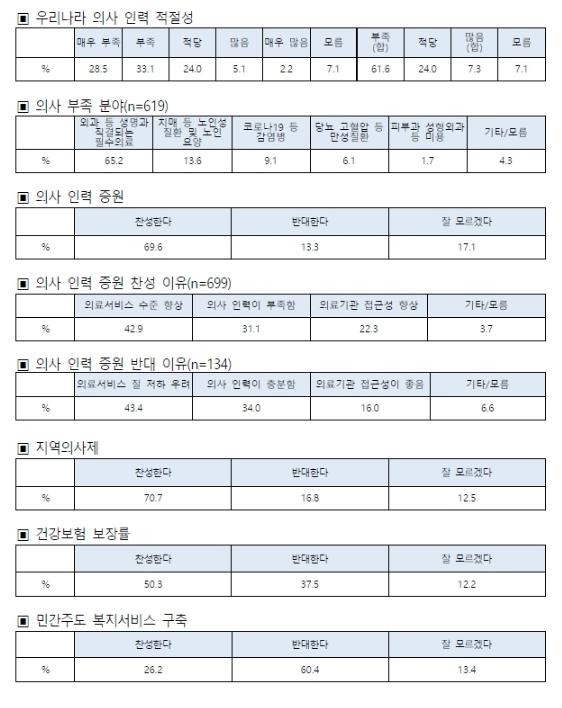 의사인력 증원에 대한 의견을 묻는 질문에는 응답자의 69.6%가 찬성한다고 답했다. 모름 17.1%, 반대는 13.3%로 나타났다. 찬성-반대간 격차는 56.3%로 찬성의견이 우세했다. 이는 지난 2020년 10월 서울대병원 공공보건의료진흥원이 진행한 의사인력 증원 여론조사 당시 찬성 64.9% 보다 5% 가량 증가한 수치다.