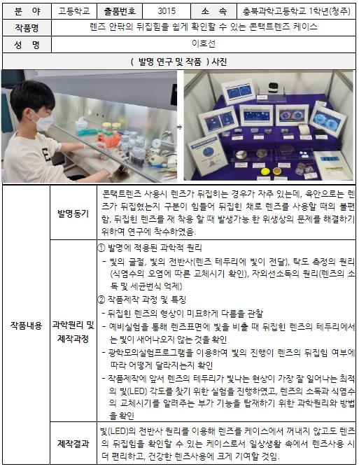 영예의 대통령상은 '렌즈 안팎의 뒤집힘을 쉽게 확인할 수 있는 콘텍트렌즈 케이스 작품'을 출품한 충북과학고등학교 1학년 이호선 학생에게, 국무총리상은 '물맷힘 걱정 없는 ABC 클린코크' 작품을 출품한 경남유어초등학교 3학년 문재인 학생에게 수여됐으며,