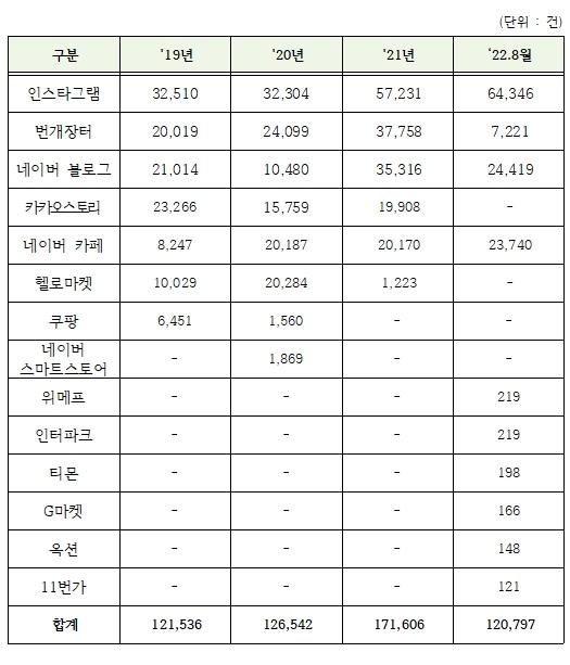 업체별 위조상품 적발건수로는 인스타그램이 18만6391건으로 가장 많았다. 이어 네이버에서 운영하는 블로그·카페·스마트스토어에서 16만5342건, 카카오스토리 7만2344건, 헬로마켓 3만1536건, 쿠팡 8011건, 위메프 219건, 인터파크 219건, 티몬 198건, G마켓 148건, 11번가 121건 순이었다.