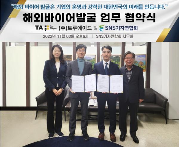 (사)SNS기자연합회(회장 김용두)와 해외바이어발굴 전문기업 ㈜트루에이드(대표 안창용)는 3일 SNS기자연합회 사무실에서 해외바이어 발굴 업무협약(MOU)을 체결했다.