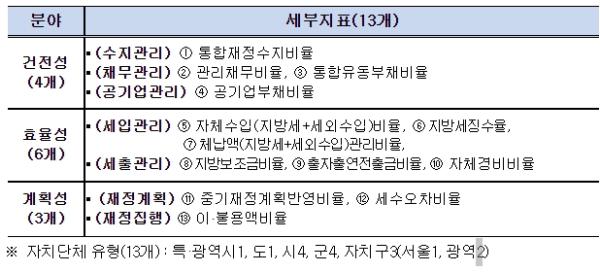 이번 재정분석은 건전성,효율성,계획성 3개 분야 13개 지표를 사용하여 지방재정을 총망라하는 수준으로 분석했고, 인구?재정 여건이 유사한 13개 자치단체 군으로 유형화하여 평가했다.