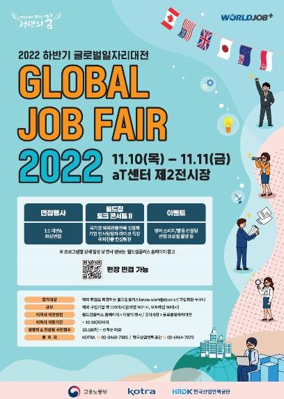 고용노동부가 주최하고 한국산업인력공단(이사장 어수봉), 대한무역투자진흥공사(사장 유정열)가 공동 주관하는 ‘2022 하반기 글로벌일자리대전’이 11월 10일 서울 양재 aT센터에서 개최된다.