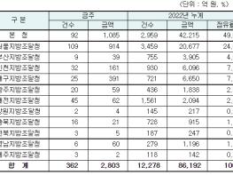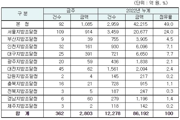 지역별 발주량을 보면 대전광역시 소재 본청 1,085억 원, 서울지방청 914억 원 등 2개청(1,999억 원)이 전체 금액(2,803억 원)의 71.3%를 차지하고 있으며, 인천 등 나머지 10개 지방청 804억 원이 각각 집행될 예정이다.