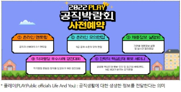 인사혁신처(처장 김승호)는 오는 21~25일 중앙행정기관, 지방자치단체, 공공기관 등이 참여하는 ‘2022 공직박람회’를 온라인으로 개최한다고 10일 밝혔다.
