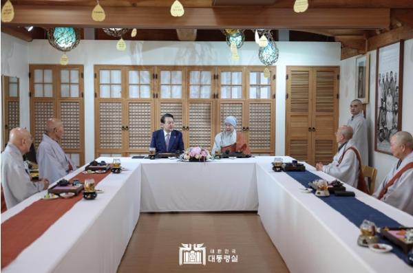 윤 대통령은 “나라의 큰 변고로 인해 많은 사람이 희생됐고, 마음을 추스르지 못하는 분들을 위해 종교계 원로들께서 격려와 힘을 주셨으면 해서 찾아뵙게 됐다” 고 말했다.