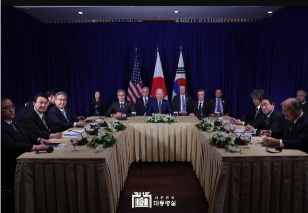 한편, 윤 대통령은 ‘자유, 평화, 번영의 인도-태평양 지역’ 비전을 실현하기 위한 우리의 독자적인 ‘인태전략’에 관해 설명했으며, 바이든 대통령과 기시다 총리는 우리의 독자적인 인태전략 발표에 대해 환영의 뜻을 표하고 향후 인태전략 이행 과정에서 3국이 긴밀히 협력해 나가기를 기대한다고 했다.