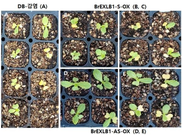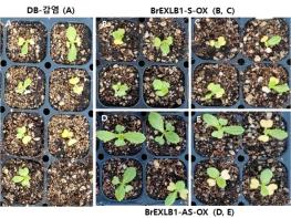 배추 EXLB1 유전자가 정상보다 강하게 발현된 배추와 약하게 발현된 배추에 뿌리혹병 곰팡이를 처리한 결과, 유전자가 약하게 발현된 배추가 일반 배추나 강하게 발현된 배추보다 뿌리혹병이 발병했을 때 강한 저항성을 가진다는 사실을 확인했다.