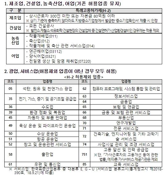 반면, 방문취업 동포(H-2)의 고용이 허용되지 않는 업종에는 인력 부족률이 낮거나 상대적으로 임금수준이 높아 내국인 일자리의 보호 필요성이 큰 정보서비스업, 교육서비스업, 금융업 등 한국표준산업분류에 따른 22개 중분류 업종이 포함된다. 다만, 허용제외 업종에 해당하더라도 기존에 고용이 허용됐던 업종에서는 방문취업 동포(H-2)를 계속 고용할 수 있다. 예를 들어, 사업시설 관리 및 조경 서비스업(한국표준산업분류 중분류 74)은 내년부터 고용이 허용되지 않지만, 기존에 허용됐던 사업시설 유지관리 서비스업(7410)과 건물 및 산업설비 청소업(7421)은 계속 고용이 허용된다.