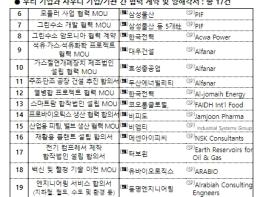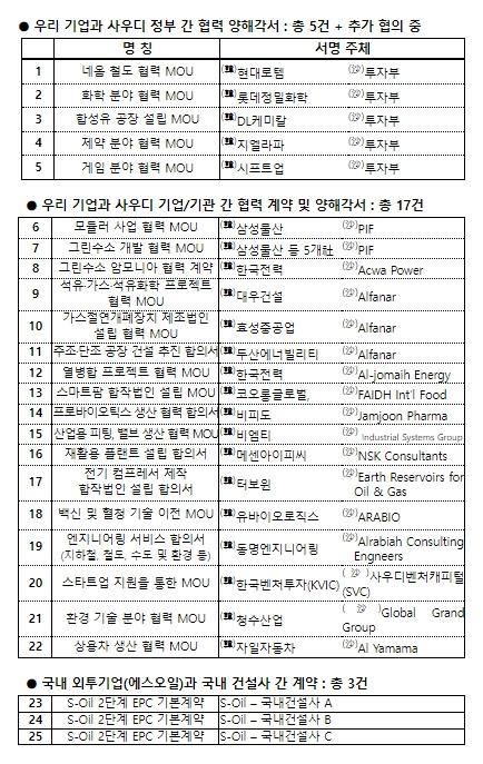 삼성물산 등 5개社와 사우디 국부펀드(PIF) 간 체결된 양해각서를 통해 사우디 내 태양광, 풍력 등 신재생 발전 및 그린 수소, 암모니아 생산 공동 추진을 위한 파트너십이 구축됐으며, 이외에도 열병합(한국전력) 및 가스·석유화학(대우건설), 가스절연개폐장치(효성중공업) 등 분야에서 에너지협력 양해각서와 함께 수소 암모니아 협력(한국전력) 계약도 체결됐다.