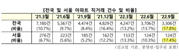 최근 전국 아파트 거래에서 직거래가 차지하는 비율이 빠르게 증가하여 ’22년 9월에는 최고점(17.8%)에 이르면서, 특수관계인 간(부모-자식, 법인- 대표 등) 증여세 등 세금을 회피할 목적으로 아파트를 시세보다 현저히 낮은 가격에 직거래하는 등 이상동향이 지속 확인되고 있다.