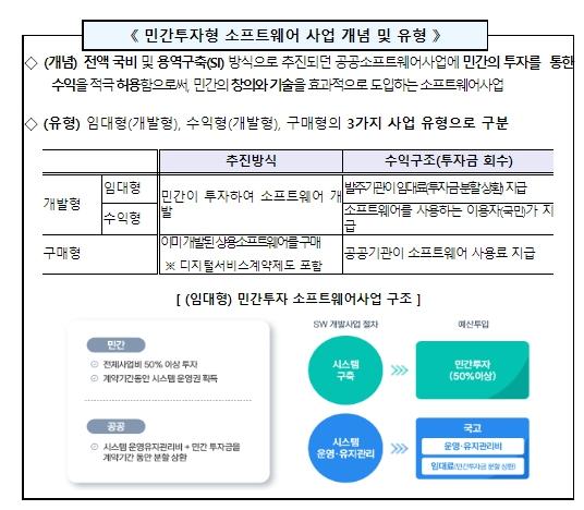 민간투자형 소프트웨어사업 제도는 전액 국고로만 추진되던 공공분야 소프트웨어개발 사업에 민간투자를 허용한 것으로 건물, 도로 등 사회기반시설 중심으로만 추진되던 민간투자 사업의 범위를 소프트웨어까지 확대한 것이다.