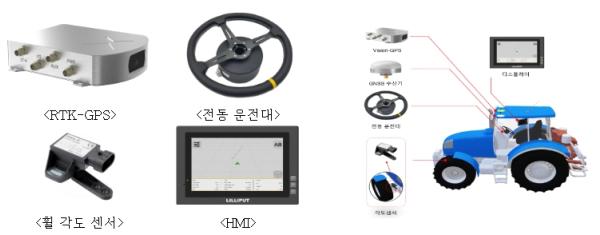 승용형 농기계용 직진 자동조향장치는 트랙터, 관리기, 이앙기 등 기존의 승용형 농기계에 붙여 사용할 수 있으며, 고정밀 자율항법장치(RTK-GPS)와 관성측정장치, 조향장치(전동 운전대), 사용자 인터페이스 장치 등으로 구성돼 있다.