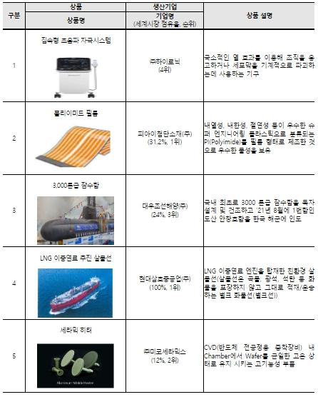 “현재 세계일류상품”에는 반도체 장비용 “세라믹 히터”((주)미코세라믹스), 내열성, 절연 특성이 뛰어나 방열 시트용으로 사용되는 “폴리이미드 필름”(피아이첨단소재(주)) 등 21개 품목(29개사)이 선정됐으며 “차세대 세계일류상품”에는 자동화 설비에 사용되는 “LM(Linear Motion) 가이드”((주)원에스티), LNG 선박 또는 오일 선박의 평형수 탱크 내 가스를 감지하는 “선박용 가스감지 시스템”((주)가스트론) 등 45개 품목(52개사)이 선정됐다.