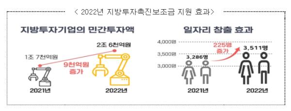 이러한 실적은 전년과 대비해 볼 때, 지방투자촉진보조금 수혜기업의 민간투자는 약 9천억원(↑52.9%) 증가했으며, 새롭게 만들어지는 일자리는 225개(↑6.8%) 증가 한 것으로 나타나, 지방투자촉진보조금 지원을 통해 지역경제 발전에 미치는 효과가 제고 된 것으로 분석된다.