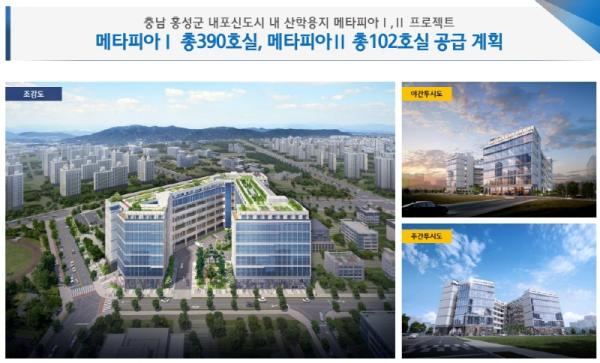 먼저 ‘메타피아Ⅰ’은 충남 홍성군 홍북읍 신경리에 지하 1층~지상 7층, 연면적 47,538.65 ㎡ 규모에 창고 및 제조형 공장과 라이브오피스를 포함한 지식산업센터, 기숙사, 근린생활시설 등이 조성될 예정이다.