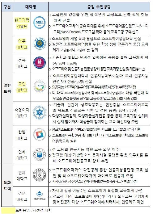 소프트웨어중심대학을 통해 대학의 소프트웨어교육체계 강화 및 소프트웨어전공 정원을 확대하고, 산업체 수요를 반영한 소프트웨어교과과정 운영, 학제 간 소프트웨어융합교육, 전교생 소프트웨어기초교육을 추진함으로써 총 21만명이 교육수혜를 받는 등 대학의 소프트웨어교육혁신을 주도해오고 있다.