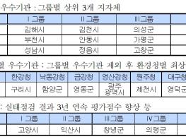 그룹별 최우수 지자체 4곳은 김해시, 김천시, 의성군, 보은군이며, 우수 지자체 8곳은 부천시, 안동시, 가평군, 성주군, 성남시, 정읍시, 고창군, 증평군이다.