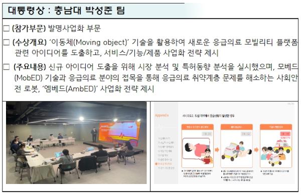 이 팀은 “재난상황 시 응급의료 대응체계가 중요하다고 느껴 응급의료 이동수단 플랫폼 사업화 전략을 제시하게 됐다”며, “상용화되어 소중한 생명을 살리는 데 도움이 되기를 바란다”고 밝혔다.