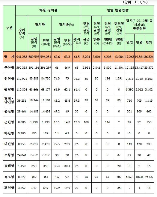 전국 12개 항만의 컨테이너 장치율(62.6%)은 평시(`22.10월, 64.5%) 수준이나, 전일 17시부터 금일 10시까지 컨테이너 반출입량은 6,208TEU로서, 주말 영향 등으로 평시(36,824TEU) 대비 17% 수준으로 크게 감소했다.