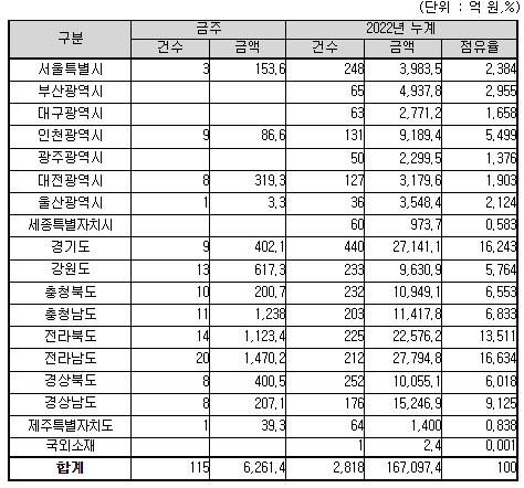 이번 주 집행예정인 115건 중 88건은 지역제한 입찰 또는 지역의무 공동도급 대상공사로, 2,760억 원 상당(44%)을 지역업체가 수주할 수 있을 것으로 예상된다.