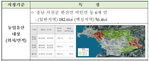 국가중요농업유산은 농업인이 해당 지역에서 환경·사회·풍습 등에 적응하면서 오랫동안 형성시켜 온 유?무형의 농업자원 중에서 보전할 가치가 있는 농업자원을 국가가 지정하는 것으로 2013년부터 지금까지 18개소를 지정했다.