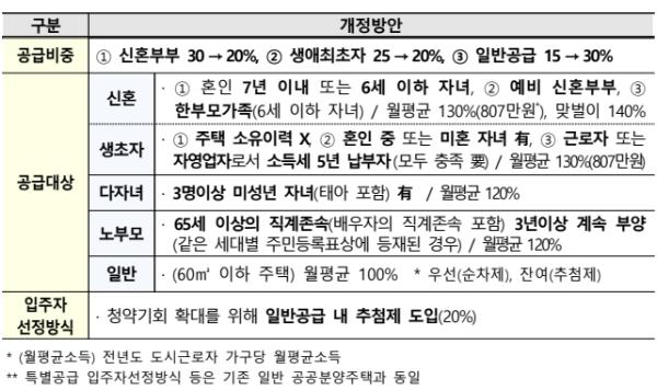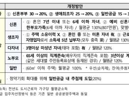 또한, 무주택 서민의 내집 마련 수요에 부응하기 위해 기존 공공분양주택 공급 한도를 ‘25% 이하’ → ‘30% 이하(5%p 증가)’로 상향한다.