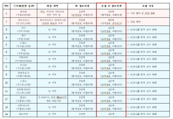 이에 따라, ?미국, 영국, 독일, 프랑스 등 24개국을 여행경보 1단계로, ?스리랑카, 카메룬 등 9개국은 여행경보 2단계로 하향 조정했으며, ?러시아, 남아공 등 12개국은 특별여행주의보를 유지했다.