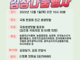 국회생생텃밭모임(회장 우상호, 간사 신정훈 엄태영)과 도시농업포럼(대표 류경오)은 2022년 국회텃밭 활동을 마감하는 폐장식과 함께 국회의원들이 담근 김치를 올여름 수해피해 지역 주민들과 소외계층, 일선 군장병 등에게 보내는 김장나눔행사를 갖는다.