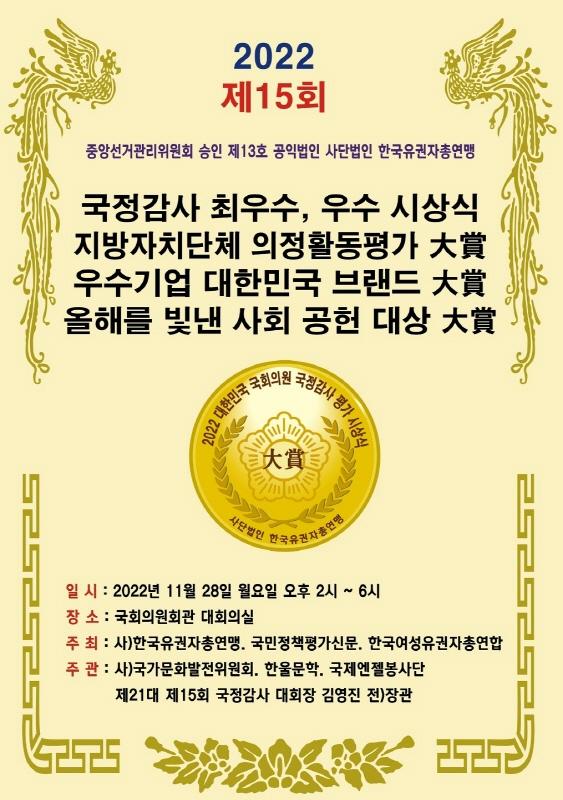 2022 제15회 국정감사 최우수, 우수 시상식이 여의도에 위치한 국회의사당 내 국회의원대회의실에서 28일 월요일 오후2시부터 주최 한국유권자총연맹, 국민정책평가신문, 한국여성유권자총연맹, 주관 국가문화발전위원회, 한올문학, 국제엔젤봉사단, 제21대 제15회 국정감사 대회장 김연진 전)장관의 진행으로 성대히 막을 개최됐다.